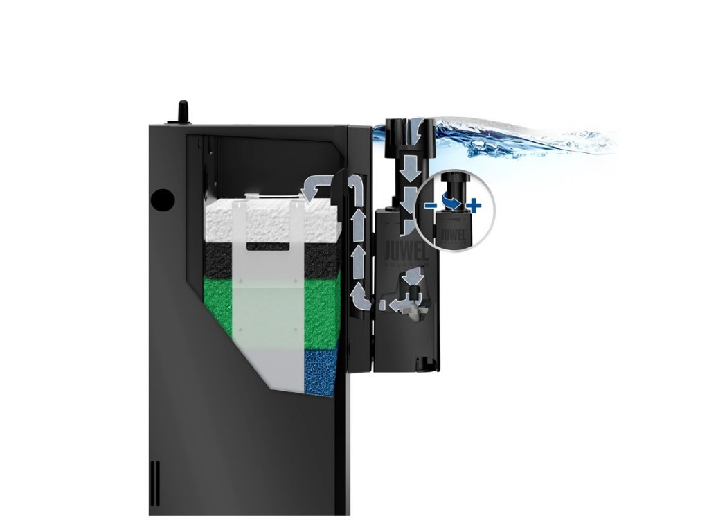 Priebežne nastaviteľný skimmerový výkon - Účinnosť skimmerování JUWEL EccoSkim môže byť individuálne riadená. Sanie možno nastaviť a prispôsobiť požiadavkám akvária otáčaním regulačnej rúrky.