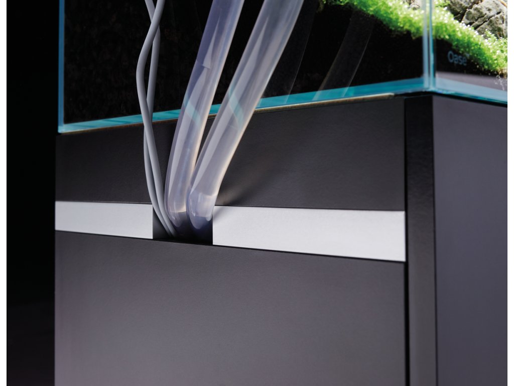 Z bokov skriniek sú magnetom upevnené záslepky pre inštaláciu káblov a hadíc, môžete si zvoliť na ktorej strane skrinky vyvediete technológiu. V zadnej časti akvária, sú v spodnej časti aj z vrchu otvory pre inštaláciu.