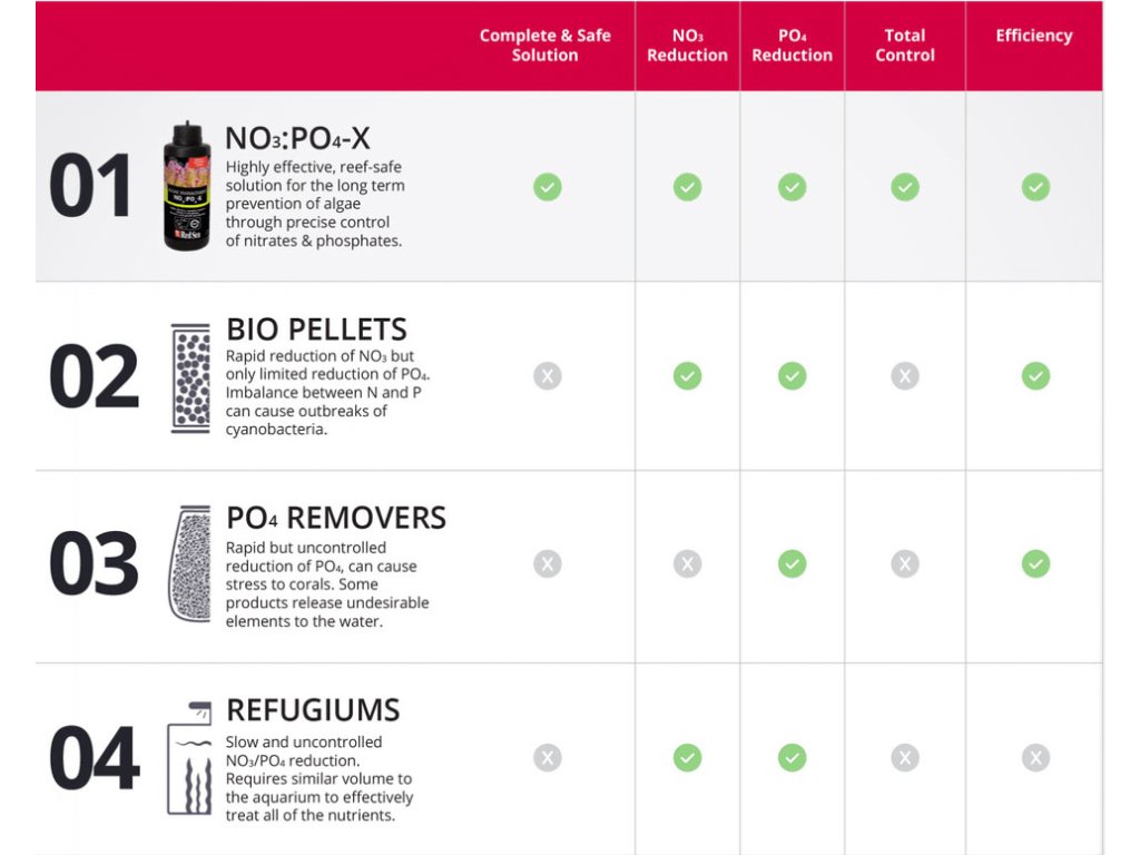 Používaním NO3:PO4-X sa dosahuje stabilná nízka hladina živín, čo vedie k potlačeniu rastu nežiaducich rias a zároveň k lepšiemu rastu a vyfarbeniu LPS aj SPS koralov.
