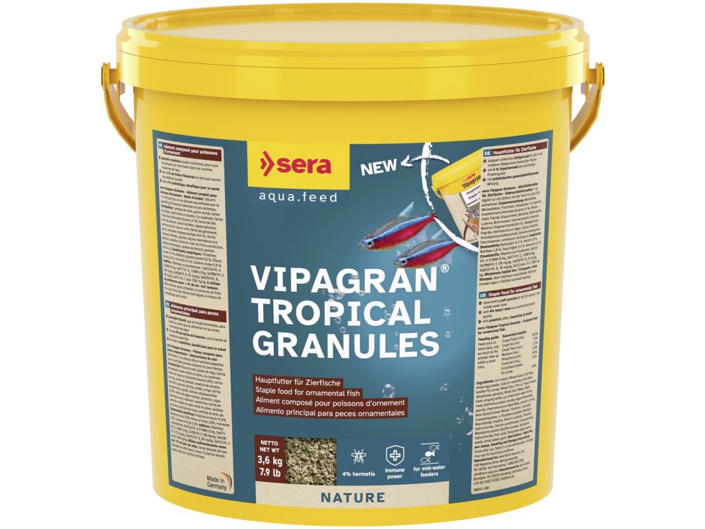 Sera Vipagran je špičkové, jemne granulované krmivo, ktoré predstavuje ideálnu dennú stravu pre všetky druhy stredne veľkých a väčších akváriových rýb. Jeho vyvážené a pestré zloženie, obohatené o dôležité vitamíny, minerály a stopové prvky, zaisťuje zdravý rast, vitalitu, silný imunitný systém a sýte, prirodzené vyfarbenie vašich obľúbencov.